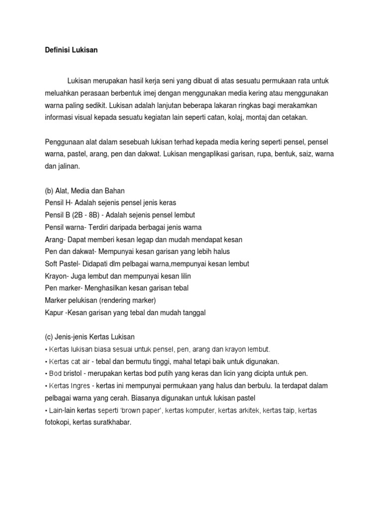 Sebenarnya sejarah seni melibatkan apa-apa jua yang berkaitan dengan kerja seni itu sendiri. Pengertian lukis menurut Galeria Fasya Art Studio adalah cabang atau bagian dari seni rupa dimana wujud dari lukis itu sendiri merupakan karya dua dimensi dwi matra walaupun memiliki dasar pengertian yang sama dengan seni rupa namun lukis memiliki arti yang lebih karena lukis merupakan sebuah pengembangan yang lebih utuh dari sekedar. Media yang digunakan dapat berupa kanvas papan kertas kain maupun media 2 dimensi lainnya.